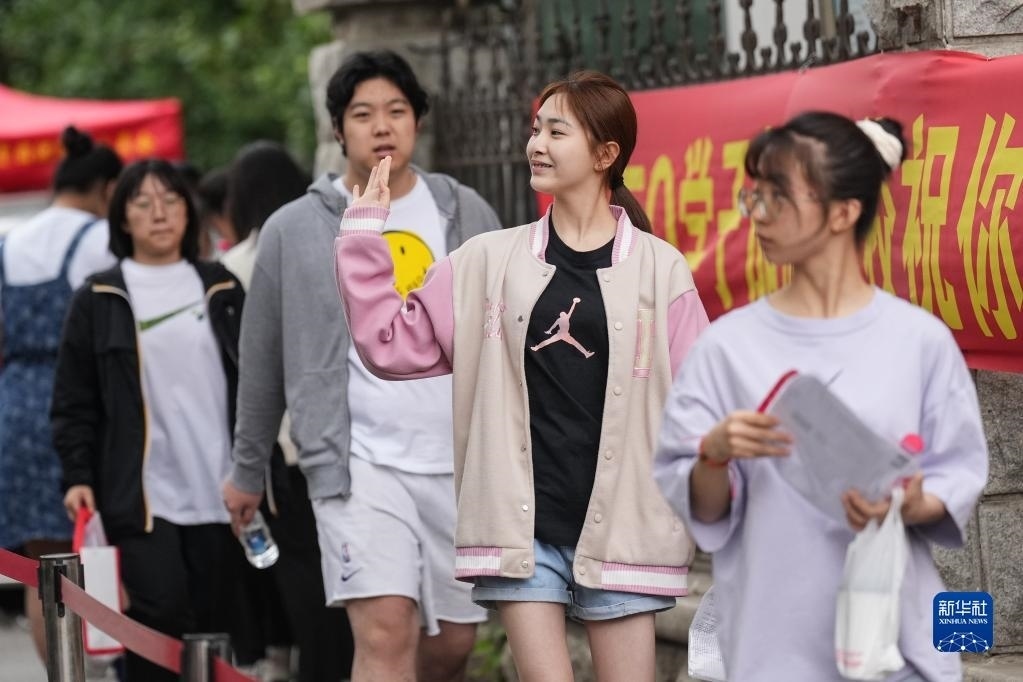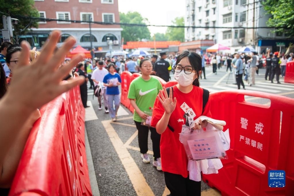 6月7日,在北京師范大學(xué)附屬實(shí)驗(yàn)中學(xué)考點(diǎn)門口,考生走進(jìn)考點(diǎn)后向家長(zhǎng)揮手。   新華社記者 李鑫 攝