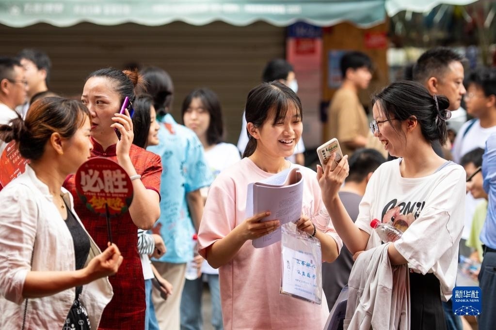 6月7日,在湖南長(zhǎng)沙市第一中學(xué)考點(diǎn),考生在考場(chǎng)外和同學(xué)聊天。   新華社記者陳思汗攝