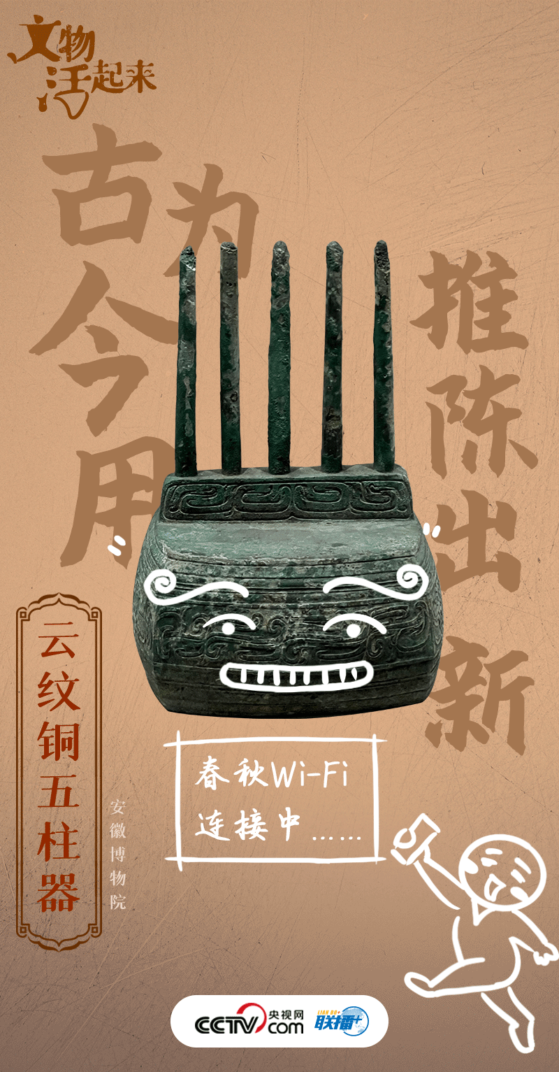 這件文物名為“云紋銅五柱器”,斷代為西周(公元前1046年-公元前771年),用途待考。早年有人認(rèn)為它是樂(lè)器,該觀點(diǎn)很快被否定。后有人認(rèn)為是某種器物的底座,亦是語(yǔ)焉不詳。還有人認(rèn)為是古人祭祀祖先時(shí)插先祖牌位的底座,這種觀點(diǎn)也有待于學(xué)術(shù)界論證。