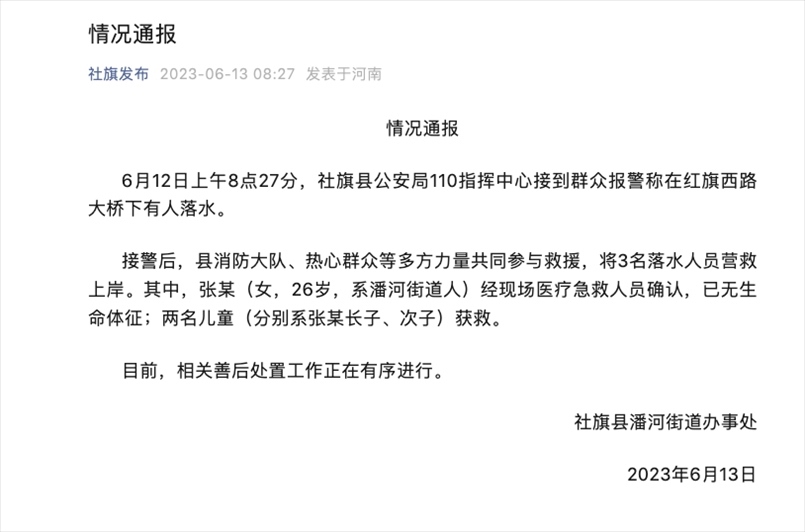 ·網(wǎng)傳南陽26歲媽媽帶2幼兒跳河,官方通報(bào):女子已離世,兩名兒童獲救。