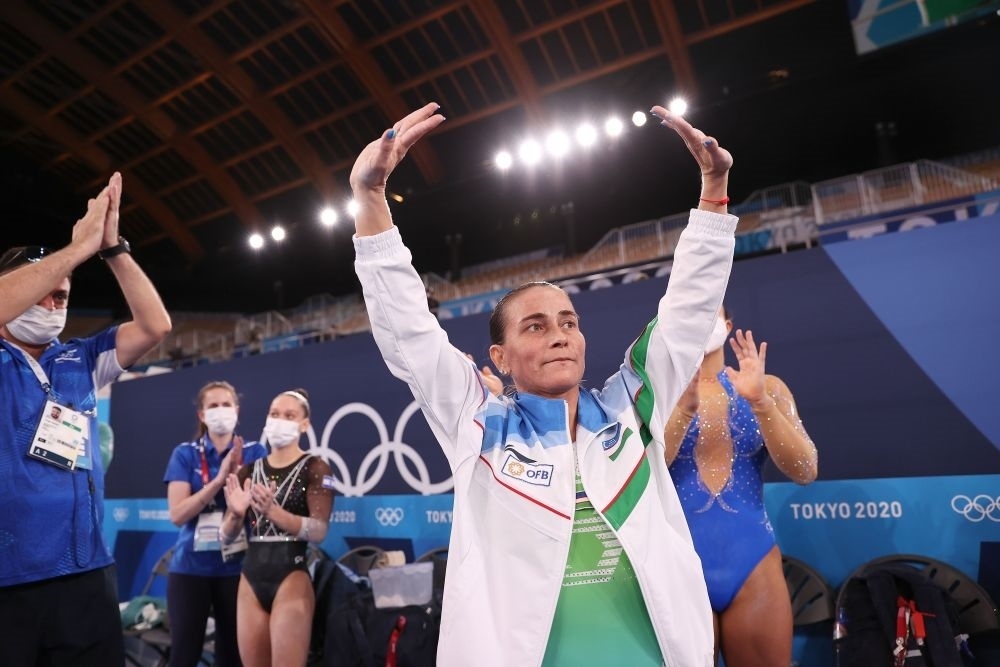 2021年7月25日,46歲的烏茲別克斯坦體操名將丘索維金娜在東京奧運(yùn)會(huì)體操女子資格賽后向觀眾揮手致意。新華社記者 曹燦 攝