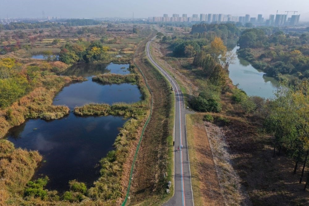 2022年11月12日,運(yùn)動(dòng)愛好者們?cè)谡憬『贾菔杏嗪紖^(qū)瓶窯鎮(zhèn)北湖草蕩生態(tài)濕地的健身游步道上參加健康跑比賽(無人機(jī)照片)。新華社記者 徐昱 攝