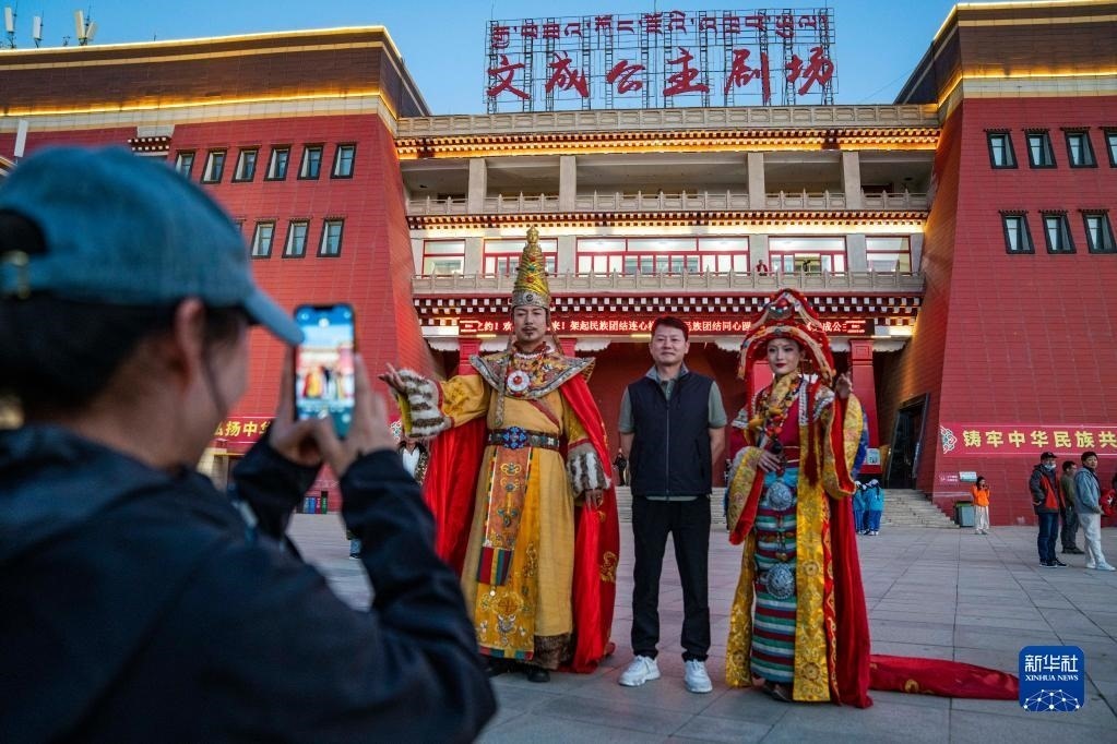 游客在文成公主劇場(chǎng)前和演員合影留念(6月6日攝)。
