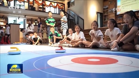 在紹興竹田頭村,偏遠(yuǎn)村落的孩子們正在新建的農(nóng)家書(shū)屋里體驗(yàn)冰壺課。