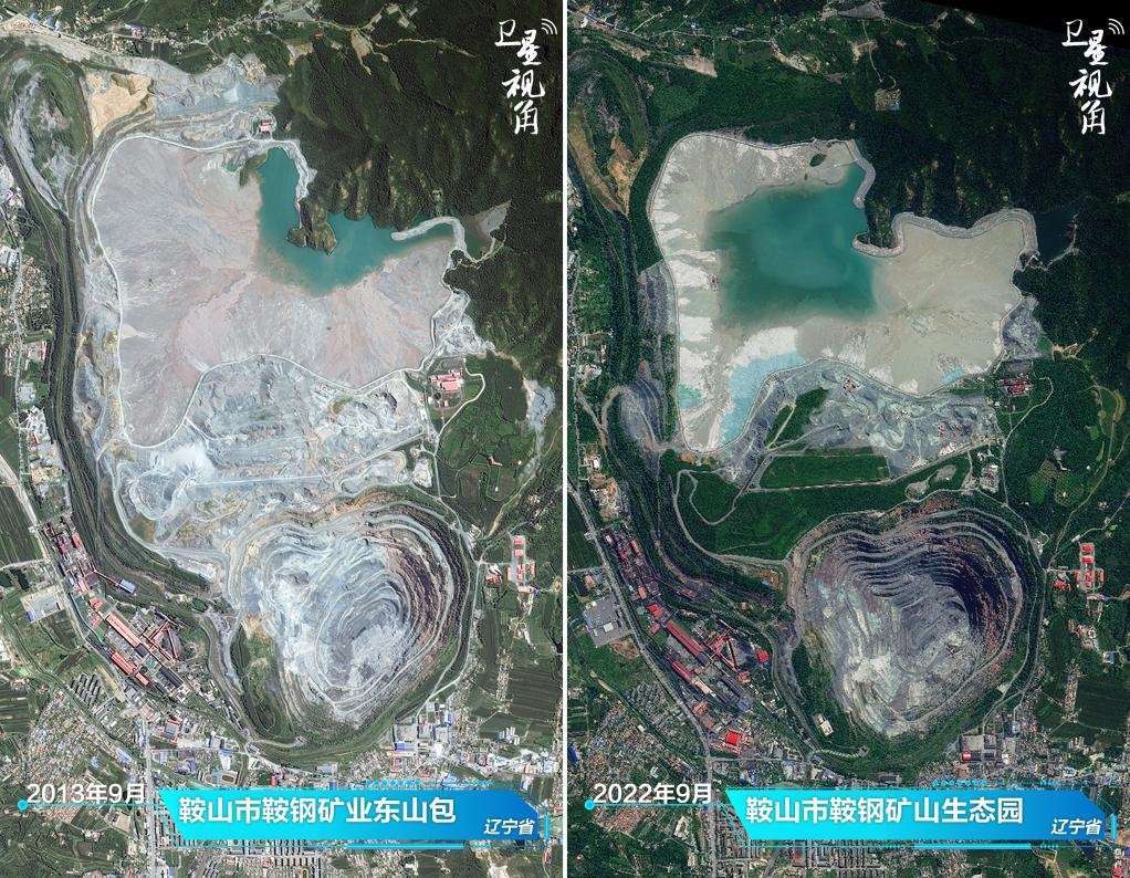 ↑2022年與2013年相比,曾經(jīng)塵土飛揚(yáng)的鞍鋼礦山,如今蛻變?yōu)闈M眼綠意的生態(tài)園。
