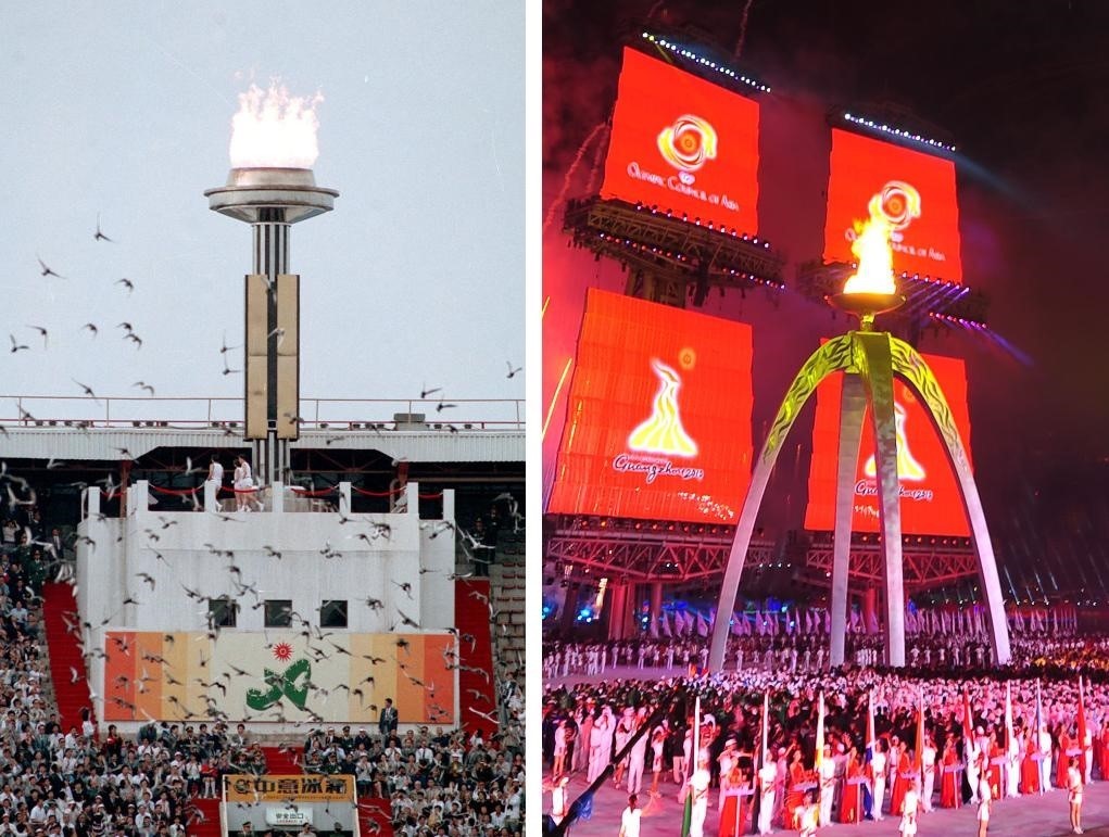 左圖:1990年9月22日,第十一屆亞運會開幕式在北京工人體育場舉行。