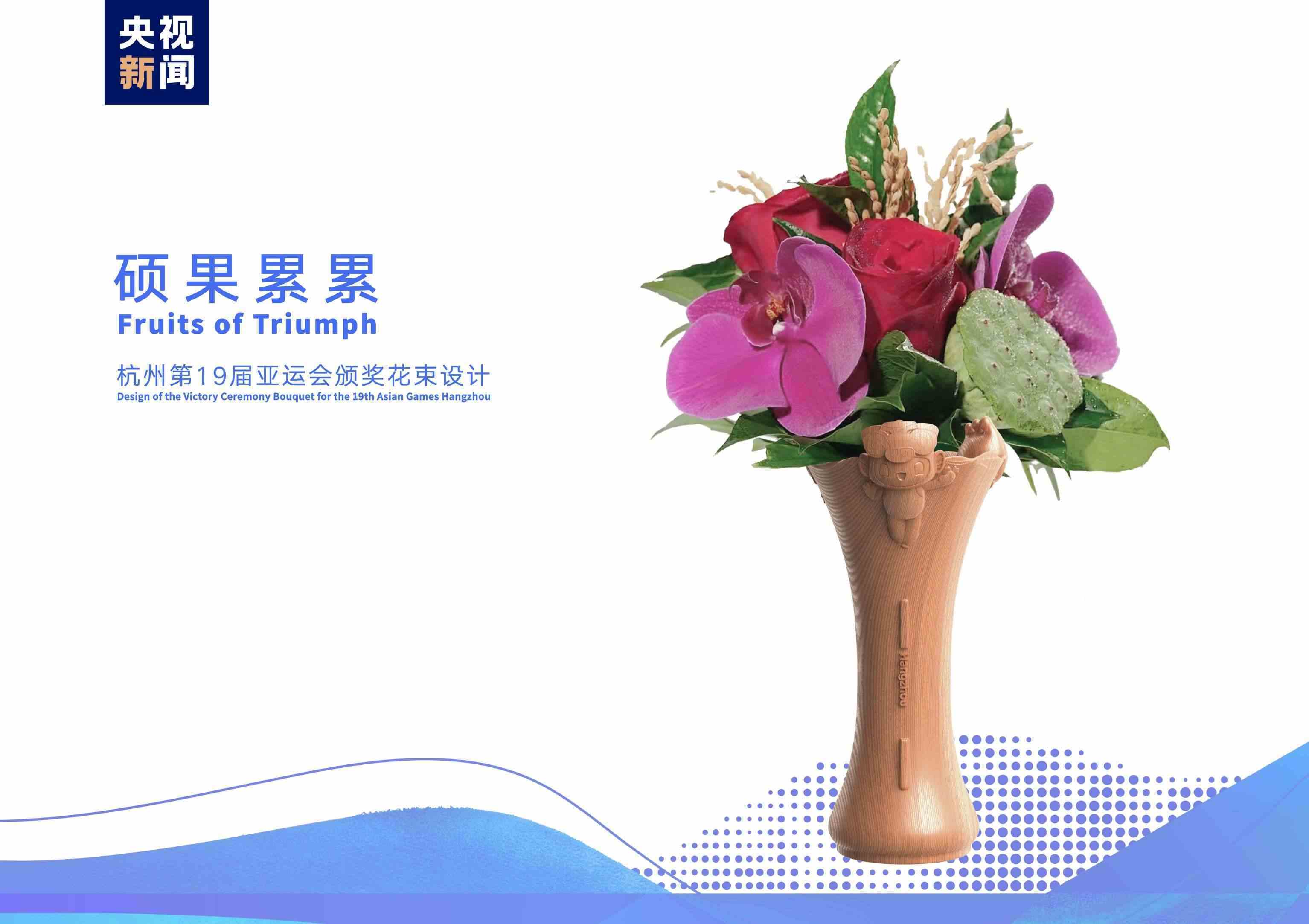 頒獎花束名為“碩果累累”,花材以寓意豐收和成果的稻穗和蓮蓬,名為“赤子之心”的中國自育品種月季,代表亞運“虹韻紫”的蝴蝶蘭,以及杭州特色植物龍井茶枝和桂花枝等組成,展現(xiàn)杭州獨特的文化內(nèi)涵和城市魅力。