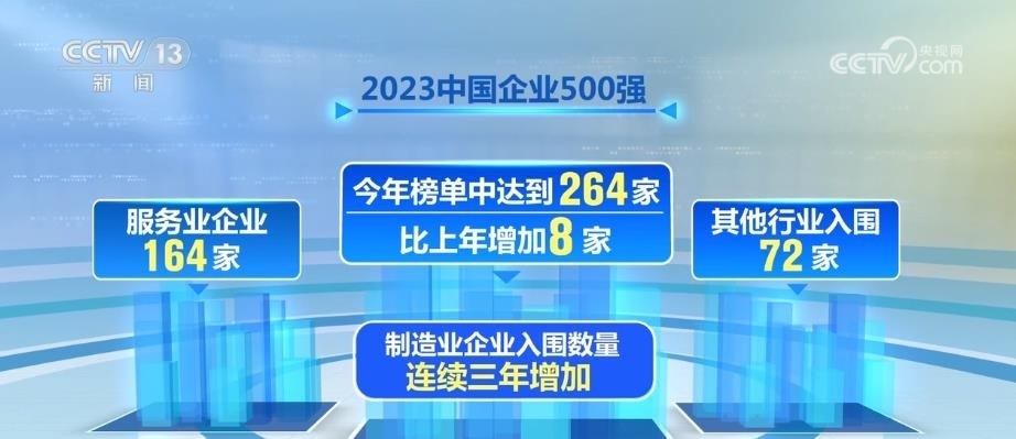 9月20日,中國企業(yè)聯(lián)合會發(fā)布了“2023中國企業(yè)500強(qiáng)”榜單。2023中國企業(yè)500強(qiáng)中,制造業(yè)企業(yè)入圍數(shù)量連續(xù)三年增加,2023年榜單中達(dá)到264家,比上年增加8家,服務(wù)業(yè)企業(yè)164家,其他行業(yè)入圍72家。從換榜情況來看,有48家新入圍或重新入圍企業(yè),這些企業(yè)中,制造業(yè)有28家,占比58.33%。