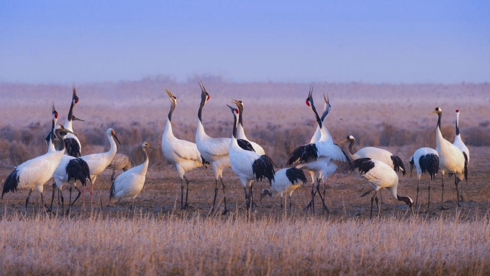 丹頂鶴等棲息在江蘇鹽城濕地珍禽國家級(jí)自然保護(hù)區(qū)。