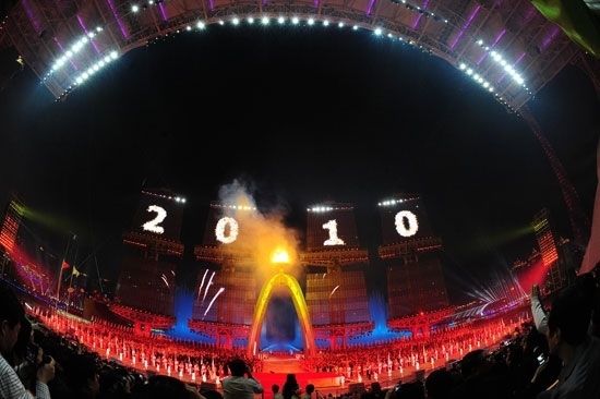 2010年11月12日,廣州,第十六屆亞運(yùn)會(huì)開(kāi)幕式在海心沙島隆重舉行,圖為主火炬點(diǎn)火儀式。視覺(jué)中國(guó)供圖