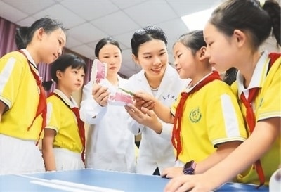 不久前,在湖南省衡陽(yáng)市雁峰區(qū)環(huán)城南路小學(xué),南華大學(xué)衡陽(yáng)醫(yī)學(xué)院醫(yī)路陽(yáng)光口腔健康科普協(xié)會(huì)的志愿者在教小學(xué)生們?nèi)绾握_刷牙。