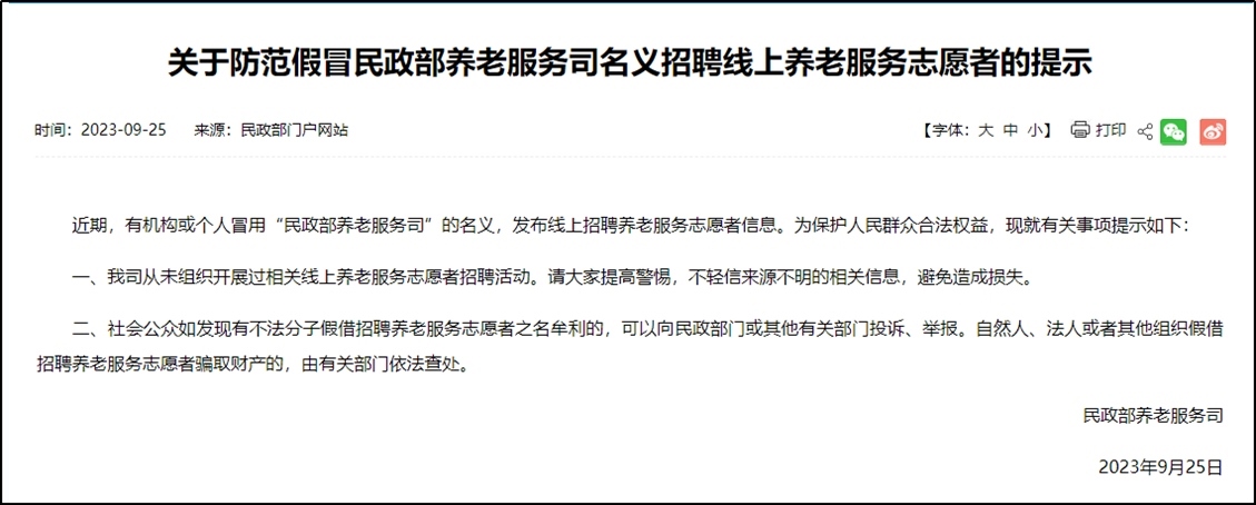 ·有機構或個人冒用“民政部養(yǎng)老服務司”名義招聘志愿者,民政部發(fā)布提示。