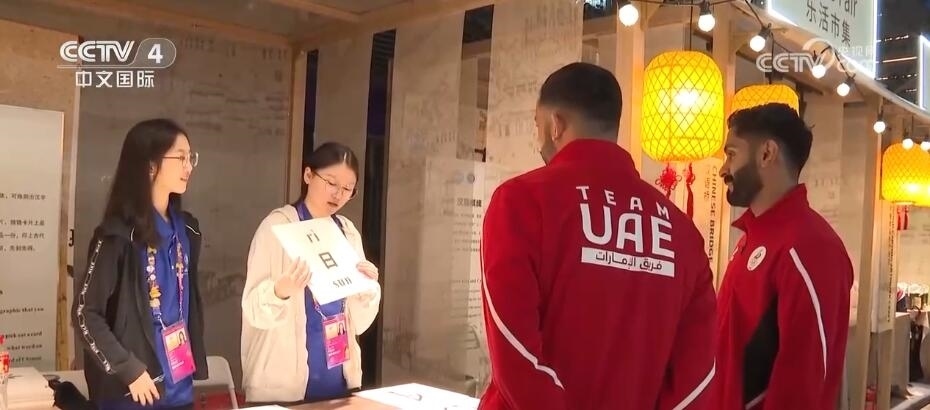 阿拉伯聯(lián)合酋長(zhǎng)國(guó)的擊劍隊(duì)隨隊(duì)官員們也在文化市集上興致勃勃地體驗(yàn)甲骨文猜字謎游戲。