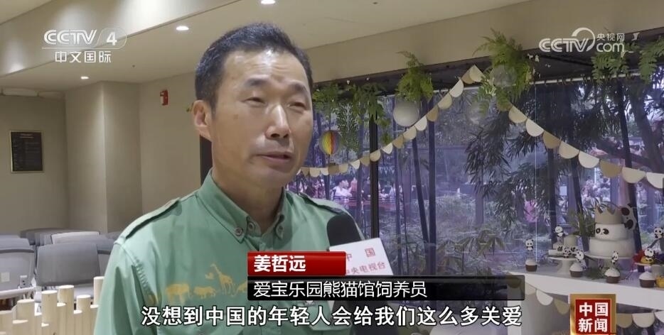 愛寶樂園熊貓館飼養(yǎng)員 姜哲遠:沒想到中國的年輕人會給我們這么多關愛,非常感謝也非常珍惜大家給我們的關注。我能做的事情其實就是像現(xiàn)在這樣,讓福寶繼續(xù)茁壯成長。