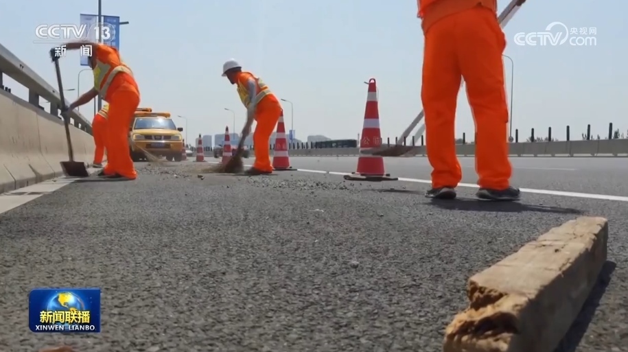 這兩天,北京持續(xù)高溫。在廣渠快速路上,道路養(yǎng)護(hù)工人正頂著烈日清理過(guò)往車(chē)輛遺撒的沙石。由于地面溫度高,這些沙石極容易引起車(chē)輛爆胎。