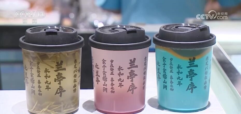 唯美的詩詞也成為了文創(chuàng)產(chǎn)品的創(chuàng)意之源。這杯文創(chuàng)茶飲的杯身上就印著王羲之名作《蘭亭集序》的部分佳句,吸引了不少年輕消費(fèi)者。