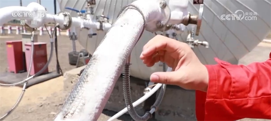 總臺記者 閆崎峰:可以看到我旁邊的這些管線上凝結(jié)了厚厚的白霜,管子里運輸?shù)木褪堑蜏匾簯B(tài)下的二氧化碳。這些二氧化碳被這些高壓泵送入距離我腳下4000多米的原油層中。加入了二氧化碳的原油會變得蓬松、流動性好,便于采集,這種方式可以提高至少18%的采收率。