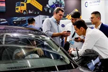 △今年4月15日,采購商在廣交會新設置的新能源及智能網(wǎng)聯(lián)汽車展區(qū)了解中國新能源汽車產(chǎn)品。