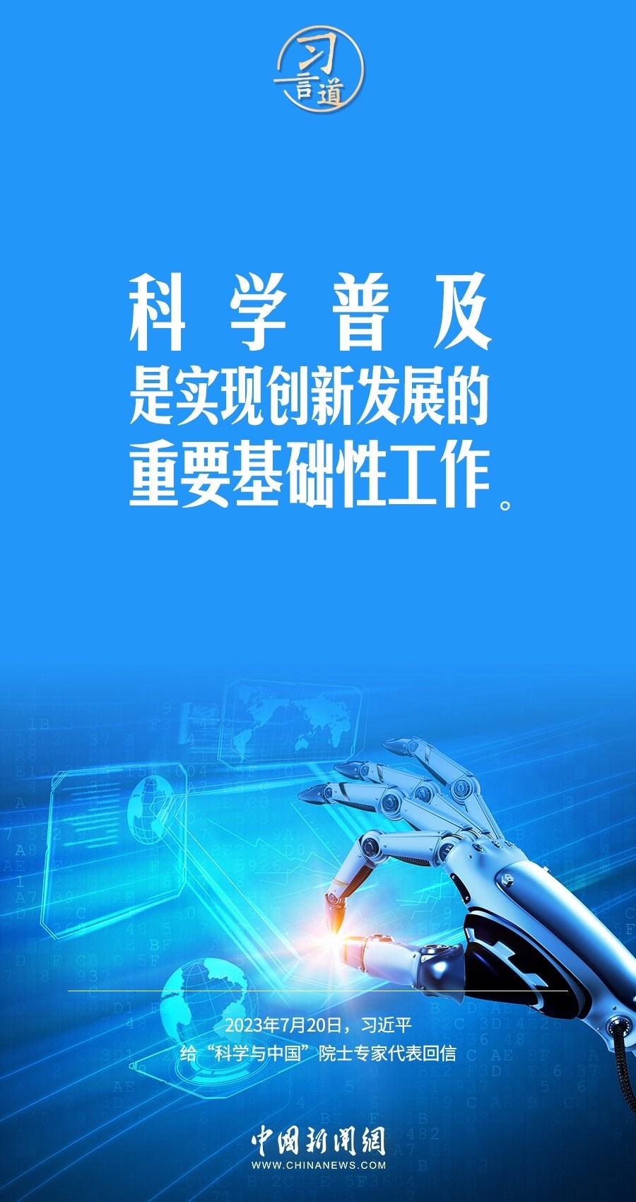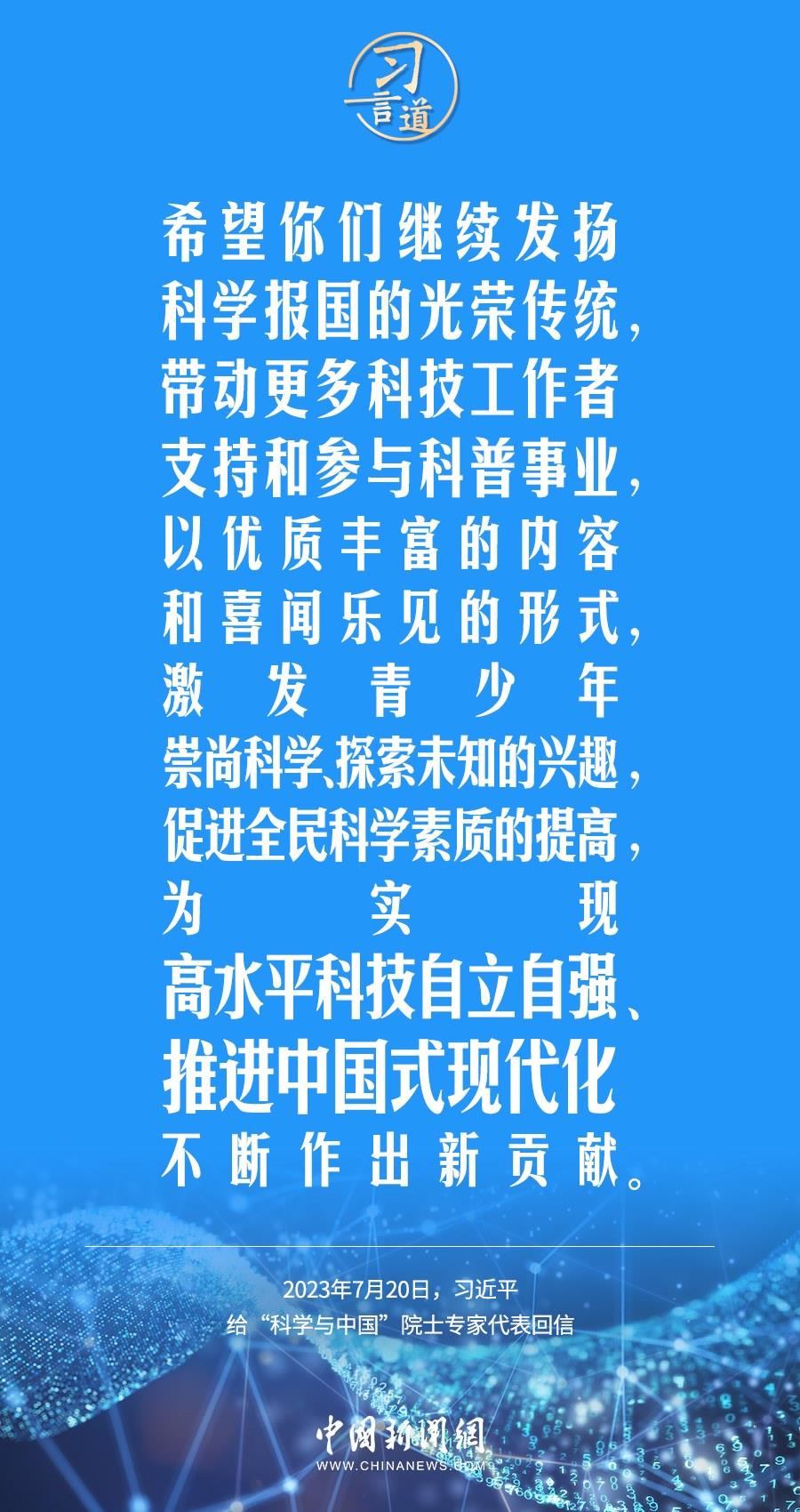 中共中央總書記、國家主席、中央軍委主席習近平7月20日給“科學與中國”院士專家代表回信,對科技工作者支持和參與科普事業(yè)提出殷切期望。他指出——