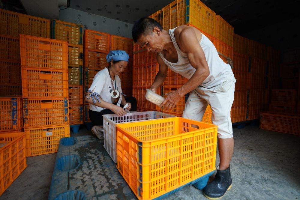 7月27日,兩名工人在劉禹丹的豆腐加工廠內(nèi)工作。新華社記者 陳欣波 攝