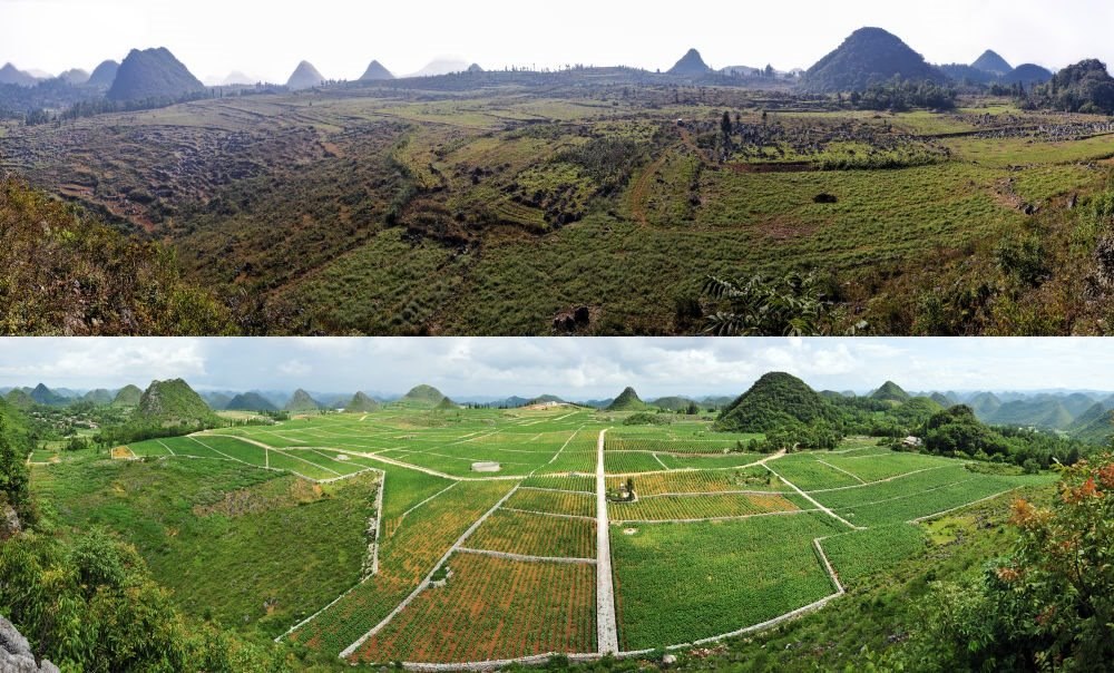 拼版照片:上圖為1991年拍攝的西疇縣大鄔麻村改造前的石漠化情況(西疇縣融媒體中心供圖);下圖為2023年7月26日拍攝的西疇縣大鄔麻村改造后的情況(新華社記者 費(fèi)茂華 攝)。