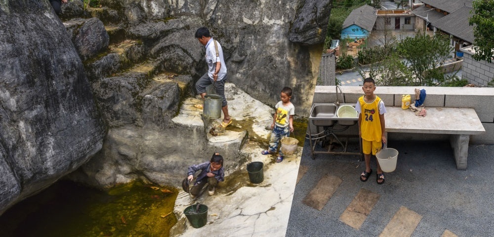 拼版照片:左圖為2014年拍攝的西疇縣巖頭村村民在石頭凹里取水,這些水是下雨時(shí)積的,當(dāng)時(shí)小村民李大鑫(右)只有5歲(西疇縣融媒體中心供圖);右圖為2023年7月26日拍攝的西疇縣巖頭村村民李大鑫在自己家的院子里接自來(lái)水(新華社記者 費(fèi)茂華 攝)。