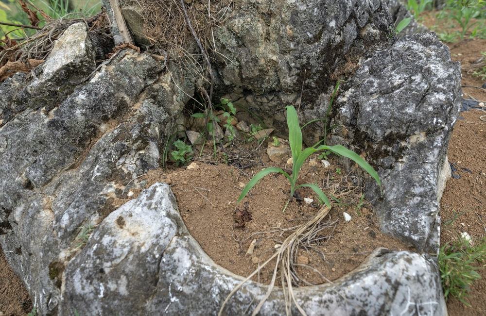 圖為2023年7月27日拍攝的一棵種在石頭凹里的玉米,西疇縣原來(lái)的土地大部分都是這樣的。新華社記者 費(fèi)茂華 攝