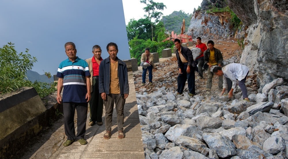 拼版照片:左圖為2009年謝成芬(前左)帶領(lǐng)村民一起修路時(shí)的資料照片(西疇縣融媒體中心供圖);右圖為2023年7月27日,謝成芬站在修好的出村公路上(新華社記者 費(fèi)茂華 攝)。