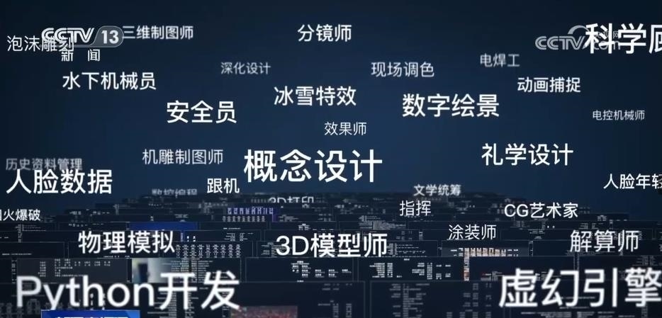 從30多萬(wàn)字的文本中,AI算法識(shí)別出了300多個(gè)電影產(chǎn)業(yè)工種,一條隱藏在幕后的國(guó)產(chǎn)電影產(chǎn)業(yè)鏈在眼前展開。這是一個(gè)電影產(chǎn)業(yè)鏈越分越細(xì)、工種越增越多的過程。20多個(gè)新的工種在這10年間誕生,動(dòng)作捕捉、虛擬拍攝、數(shù)控編程、3D打印等,其中,七成以上的新增工種跟數(shù)字化技術(shù)的進(jìn)步有關(guān)。