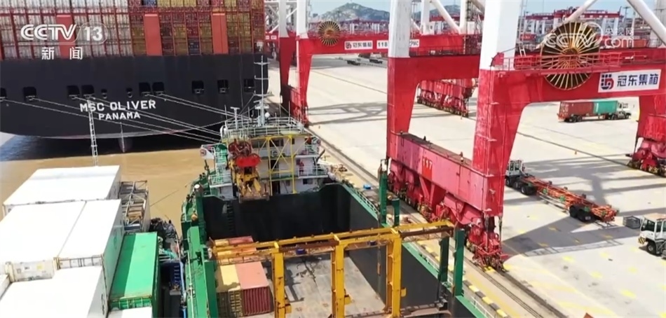 在洋山港三期冠東碼頭,兩艘大型遠(yuǎn)洋集裝箱船中間的這艘小船是來自江蘇太倉港的快航班輪,它剛剛完成200多個(gè)集裝箱裝卸。通過水路完成“水水中轉(zhuǎn)”,將這些集裝箱裝上遠(yuǎn)洋貨輪出口海外,無需轉(zhuǎn)關(guān)申報(bào)或倉儲(chǔ)停留,實(shí)現(xiàn)了聯(lián)動(dòng)接卸。