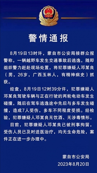 ·云南警方通報(bào)“26歲男子駕越野車(chē)連撞多車(chē)”:致7人受傷,犯罪嫌疑人有精神病史,已被刑拘。