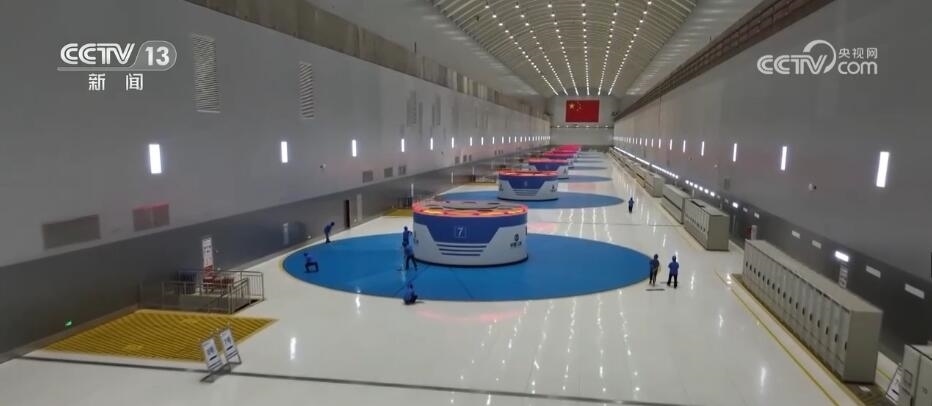 我現(xiàn)在就在白鶴灘水電站的左岸地下廠房,在我身后一字排開的,就是處于全發(fā)狀態(tài)當中的百萬千瓦水輪發(fā)電機組。站在這兒,我其實只能看到它冒出地面的3米,而在我腳下還有51米,單臺機組的總重量接近8000噸。之所以讓它成為世界級的先進的水輪發(fā)電機組,除了它的這種大體量和大功率之外,更重要的是在研發(fā)階段解決了許多世界級的難題。比如,它所克服的特殊工況下的壓力脈動,就能夠讓整臺機組在運行的時候更加的安全、穩(wěn)定。再比如說,在機組高速運轉(zhuǎn)的過程當中,對于平穩(wěn)性的要求近乎于苛刻,我現(xiàn)在就站在機組的頂板上,在地面上立了幾枚硬幣,它們現(xiàn)在是穩(wěn)穩(wěn)地立在這兒,但是如果我輕輕的施加外力,它就會傾倒,看得出來它的平穩(wěn)性。而正是一代又一代的中國水電人的不斷努力,才實現(xiàn)了水輪發(fā)電機組從跟跑到并跑到超越的發(fā)展速度。鑄造出了這樣的國之重器。