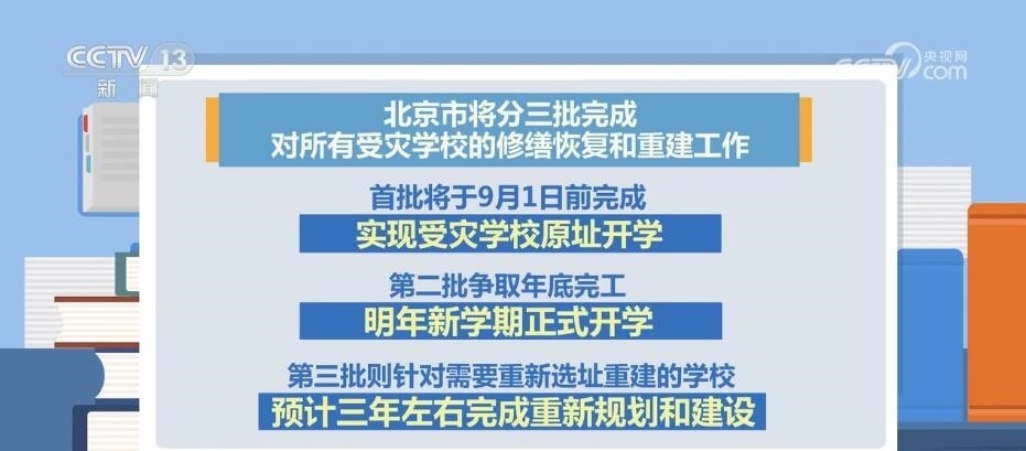 據(jù)了解,北京市將分三批完成對(duì)所有受災(zāi)學(xué)校的修繕恢復(fù)和重建工作。其中,首批將于9月1日前完成,實(shí)現(xiàn)受災(zāi)學(xué)校原址開(kāi)學(xué)。第二批爭(zhēng)取年底完工,明年新學(xué)期正式開(kāi)學(xué)。第三批則針對(duì)需要重新選址重建的學(xué)校,預(yù)計(jì)三年左右完成重新規(guī)劃和建設(shè)。