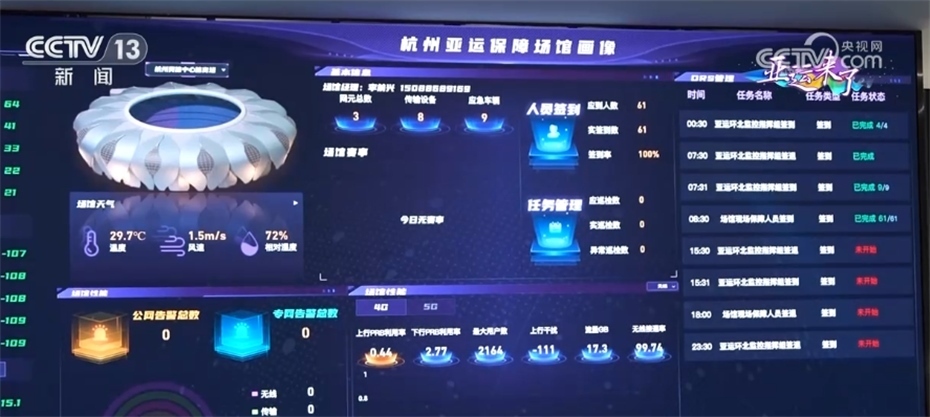 亞運(yùn)會場在技術(shù)創(chuàng)新上,會場可以滿足賽事期間數(shù)萬人同時(shí)使用4G、5G網(wǎng)絡(luò)收發(fā)視頻、圖片、撥打電話。當(dāng)局部用戶使用網(wǎng)絡(luò)數(shù)據(jù)上升的時(shí)候,場館內(nèi)的感知探針等設(shè)備會模擬和實(shí)時(shí)反饋上傳數(shù)據(jù),指揮中心屏幕上可以通過數(shù)據(jù)和紅橙黃綠四種顏色來判斷網(wǎng)速。工作人員能先于用戶,提前感知到網(wǎng)速變化并及時(shí)調(diào)度解決。