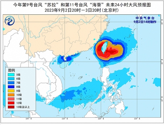 大風(fēng)預(yù)報(bào):9月2日20時(shí)至3日20時(shí),受“蘇拉”影響,廣東中西部沿海、廣西南部沿海、海南島北部沿海、珠江口及澳門等地將有6-7級(jí)大風(fēng),南海西北部、北部灣東部和瓊州海峽將有8級(jí)、陣風(fēng)9-10級(jí)的大風(fēng);受“??庇绊懀褪亢{南部、臺(tái)灣海峽西部、東海南部及釣魚島附近海域、浙江南部沿海、福建中北部沿海、臺(tái)灣島沿海將有6-8級(jí)、陣風(fēng)9-10級(jí)大風(fēng),巴士海峽北部、臺(tái)灣海峽東部、臺(tái)灣以東洋面及臺(tái)灣島南部沿海的風(fēng)力有9-12級(jí),陣風(fēng)13-14級(jí),“海葵”中心經(jīng)過的附近海面或地區(qū)的風(fēng)力有13-16級(jí),陣風(fēng)17級(jí)。