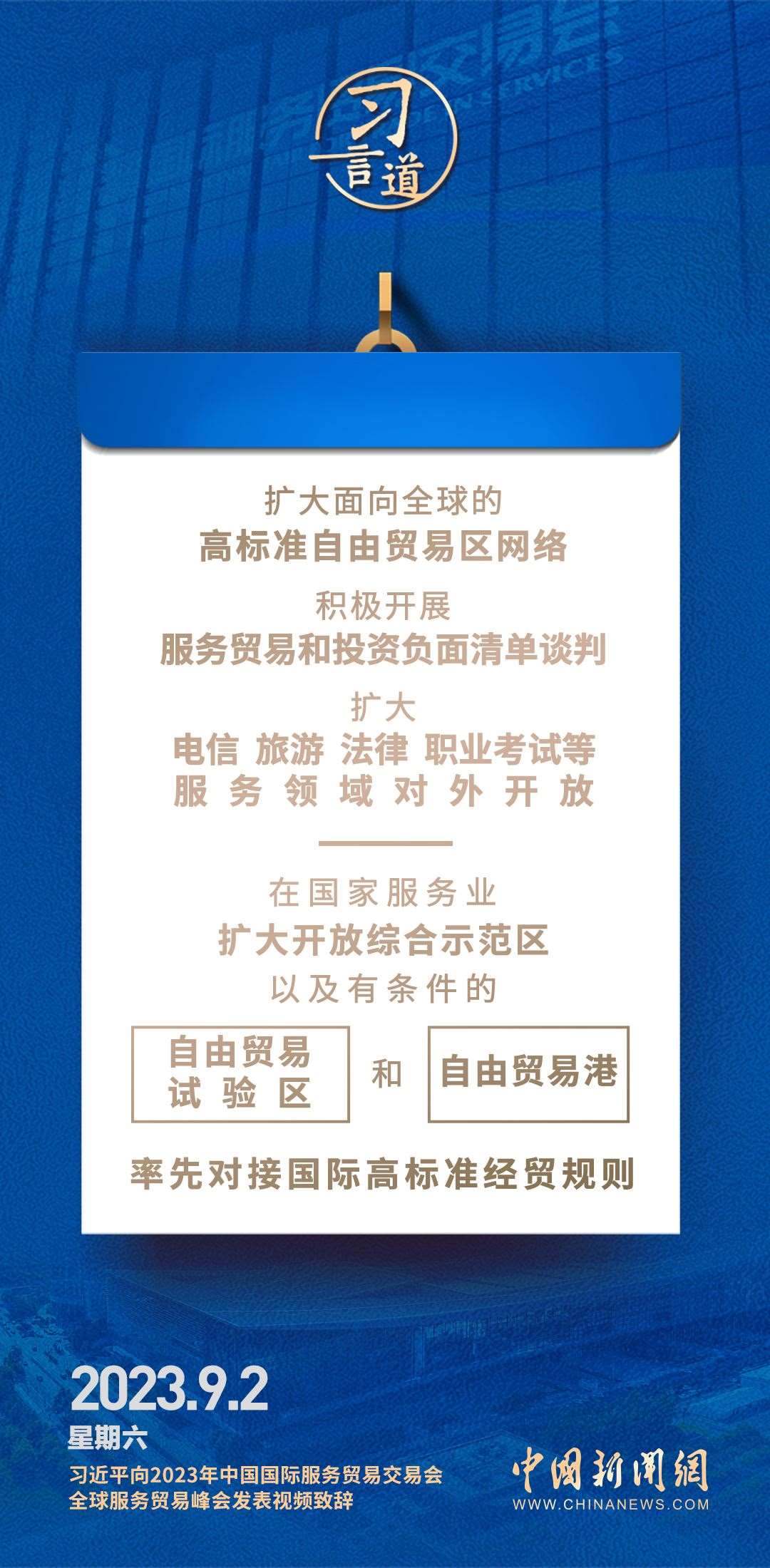 9月2日上午,國家主席習(xí)近平在北京向2023年中國國際服務(wù)貿(mào)易交易會(huì)全球服務(wù)貿(mào)易峰會(huì)發(fā)表視頻致辭。習(xí)近平指出——