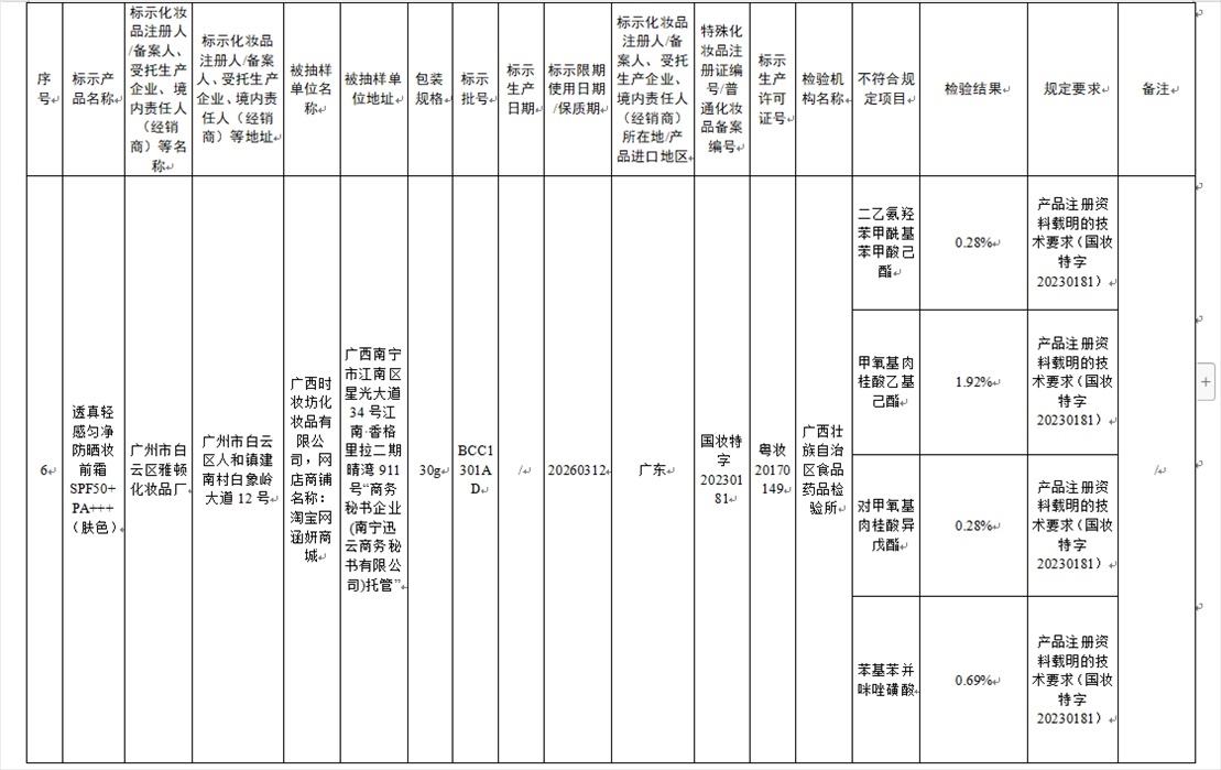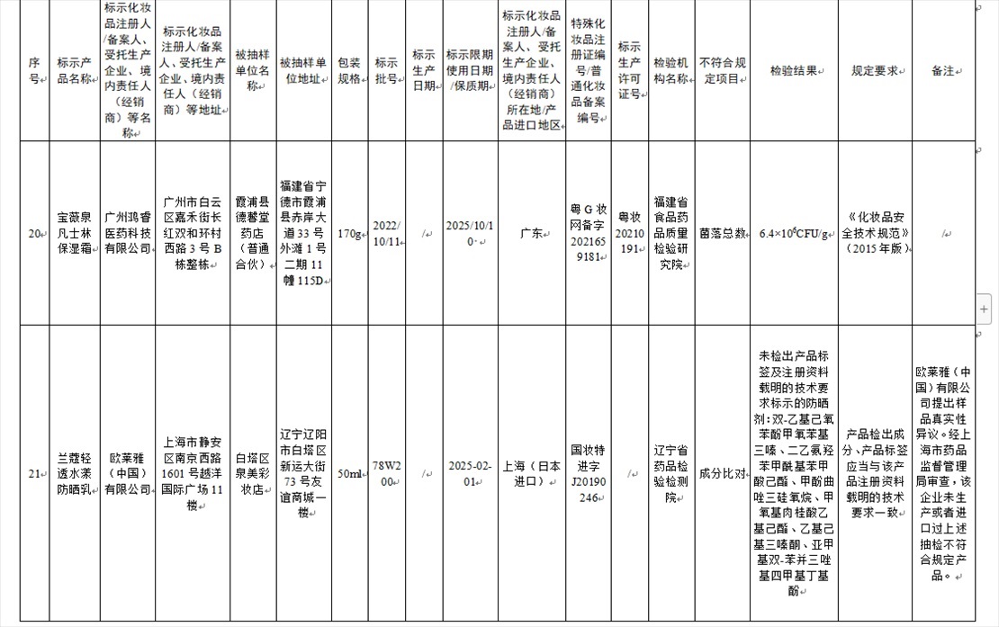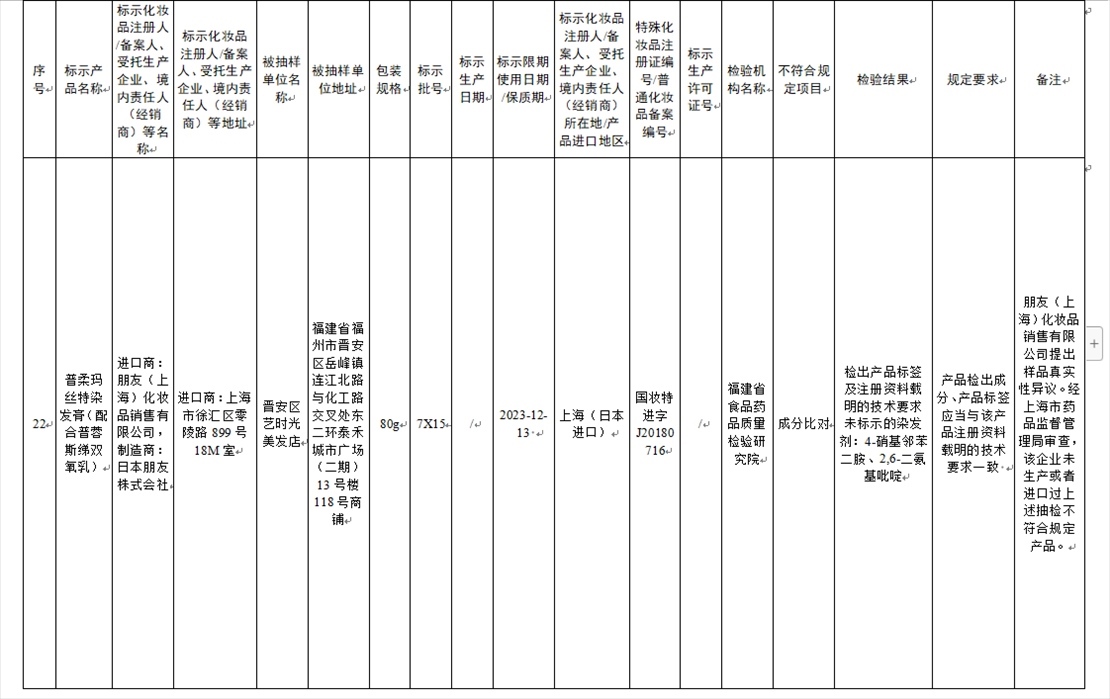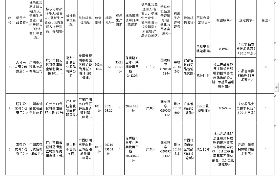 國(guó)家藥監(jiān)局網(wǎng)站今天發(fā)布通告稱(chēng),在2023年國(guó)家化妝品抽樣檢驗(yàn)工作中,經(jīng)重慶市食品藥品檢驗(yàn)檢測(cè)研究院等單位檢驗(yàn),產(chǎn)品標(biāo)簽標(biāo)示為廣州市天科化妝品有限公司生產(chǎn)的天科染發(fā)膏(自然黑)等23批次化妝品不符合規(guī)定(見(jiàn)下圖表格)。