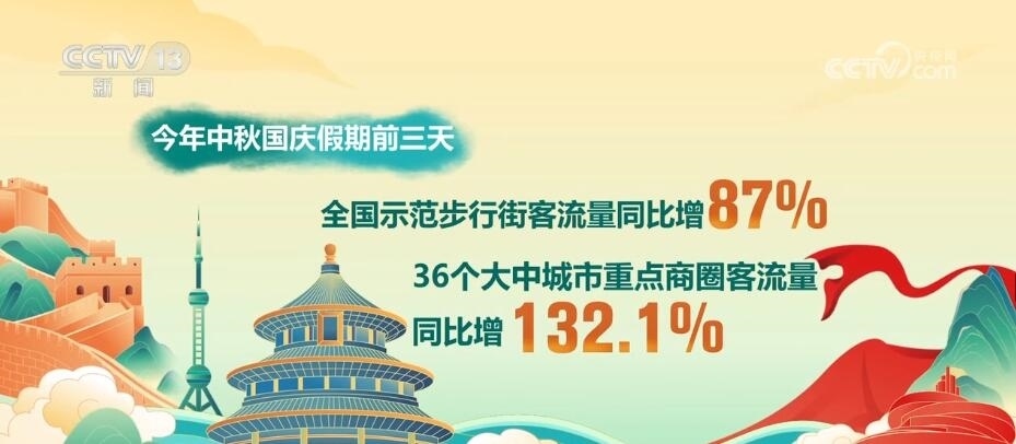 商務(wù)部數(shù)據(jù)顯示,假期前三天,重點(diǎn)商圈人氣紅火。全國(guó)示范步行街客流量同比增長(zhǎng)87%,36個(gè)大中城市重點(diǎn)商圈客流量同比增長(zhǎng)132.1%。