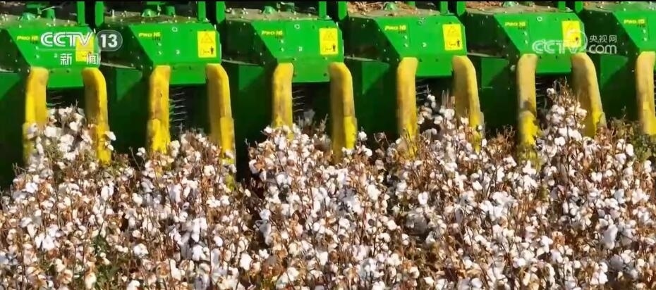 作為棉花主產(chǎn)區(qū),新疆棉花陸續(xù)進入采收季。現(xiàn)在您看到的是位于新疆昌吉瑪納斯縣的棉田。采棉機在田里穿行,所到之處,棉花從棉稈上脫離,氣流將棉花推送到儲存棉箱,采凈率高達95%以上。這樣一臺采棉機每天可采收700余畝棉花?,敿{斯是國家級優(yōu)質商品棉生產(chǎn)基地。從播種到采收,這里的機械化,大大提高作業(yè)速度和棉花質量。