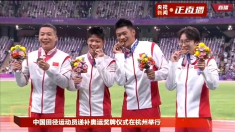 10月4日晚,杭州亞運(yùn)會(huì)田徑比賽結(jié)束后,中國(guó)奧委會(huì)在杭州奧體中心體育場(chǎng)舉行遞補(bǔ)奧運(yùn)獎(jiǎng)牌頒獎(jiǎng)儀式。