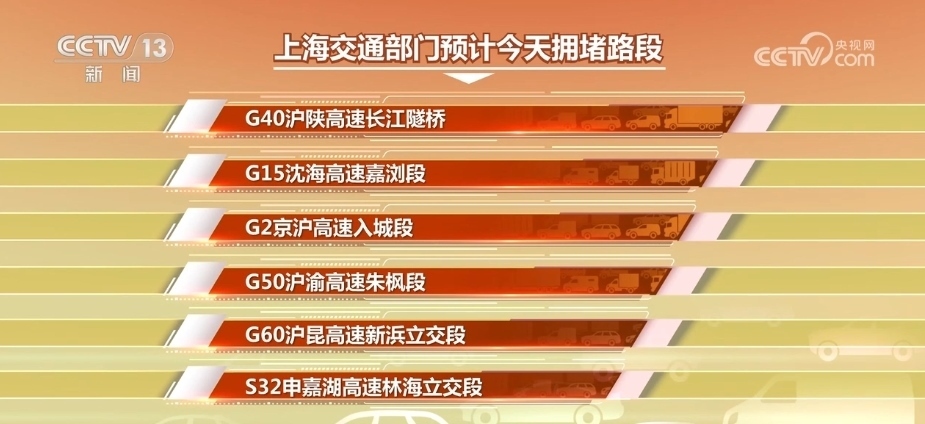 上海交通部門(mén)預(yù)計(jì),返程高峰期間,G40滬陜高速長(zhǎng)江隧橋、G15沈海高速嘉瀏段、G2京滬高速入城段、G50滬渝高速朱楓段、G60滬昆高速新浜立交段、S32申嘉湖高速林海立交段等入城方向?qū)a(chǎn)生一定擁堵。