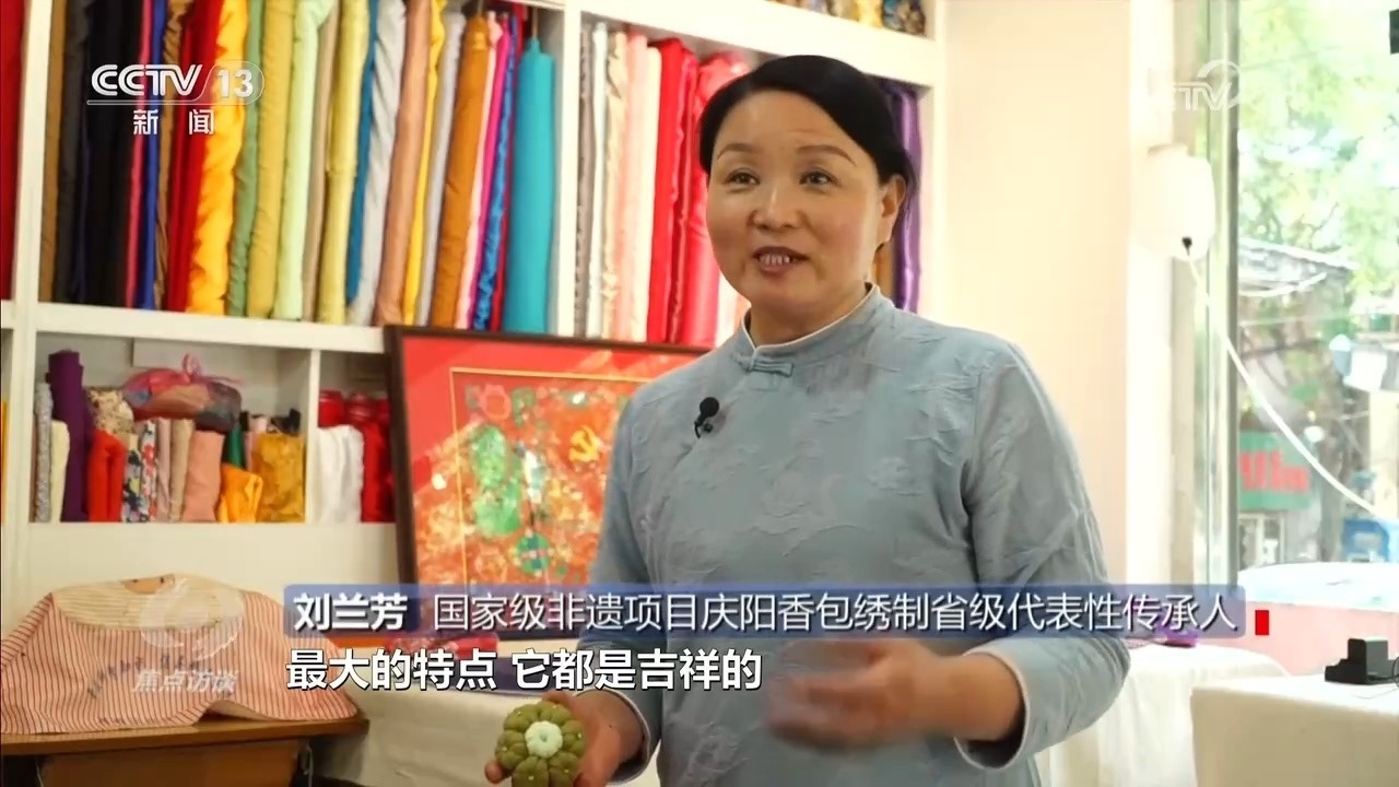 國家級(jí)非遺項(xiàng)目慶陽香包繡制省級(jí)代表性傳承人劉蘭芳:“這個(gè)針法的特點(diǎn)是一根針一根線從頭到尾不能斷頭,要一次完成,而且左右對(duì)稱、上下對(duì)稱,我們祖祖輩輩傳承到今天?!?/p>