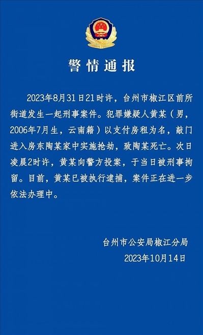 ·浙江臺(tái)州警方通報(bào)17歲少年殺害65歲房東:已逮捕。