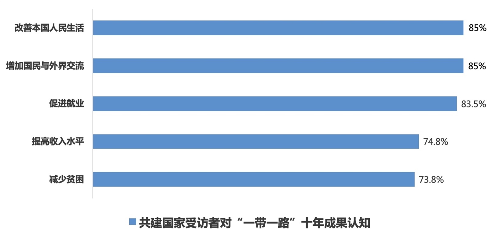 “一帶一路”倡議下一個(gè)個(gè)“惠而實(shí)”的民生工程、民心工程,為各國(guó)人民帶來(lái)實(shí)實(shí)在在的獲得感、幸福感和安全感,85%的共建國(guó)家受訪者認(rèn)為“一帶一路”切實(shí)改善了本國(guó)人民的生活;85%的共建國(guó)家受訪者認(rèn)為通過“一帶一路”民眾獲得了更多與外界交流互鑒的機(jī)會(huì);分別有83.5%、74.8%和73.8%的共建國(guó)家受訪者認(rèn)可共建“一帶一路”在促進(jìn)就業(yè)、提高居民收入水平和減少貧困方面的作用;86.5%的共建國(guó)家受訪者認(rèn)為“一帶一路”倡議和“以人民為中心”的理念高度契合,惠及全球民眾的愿景正在逐步變?yōu)楝F(xiàn)實(shí)。