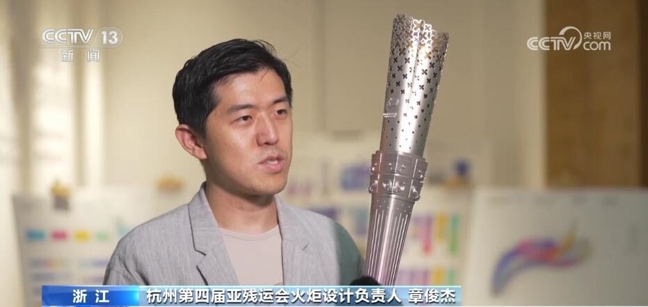 杭州第四屆亞殘運(yùn)會火炬設(shè)計(jì)負(fù)責(zé)人 章俊杰:玉琮是實(shí)證中華五千年(文明史)的良渚(遺址)文明當(dāng)中的一個重要禮器,我們把玉琮作為核心意象,外方內(nèi)圓,我們在舉起火炬的時候,所有人的視覺焦點(diǎn)玉琮它承上啟下,分別代表了不同的寓意。承上,我們用點(diǎn)點(diǎn)的星光匯聚成桂花桂冠,可以看到星光越來越稠密,這是我們希望體現(xiàn)整個火炬設(shè)計(jì)的積極向上的那種力量感;玉琮往下,在這個地方設(shè)計(jì)有幾十條的科技線,它就好像是綿延著人類的歷史和城市科技的脈絡(luò)。
