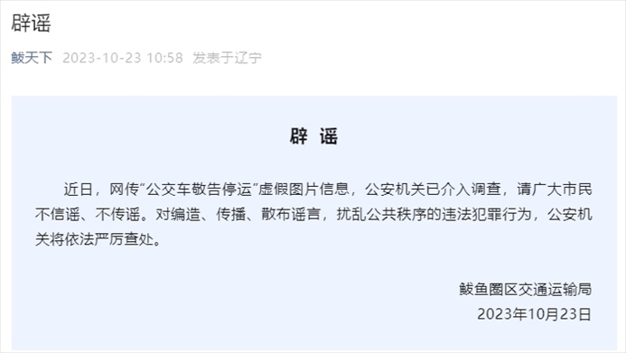 ·網(wǎng)傳“公交車敬告停運”,遼寧營口鲅魚圈區(qū)交通運輸局辟謠:系虛假圖片,公安已介入。