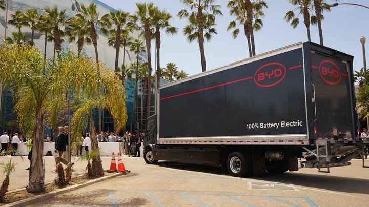 2022年5月10日,人們在美國加利福尼亞州長灘市舉行的2022年先進清潔運輸博覽會上參觀比亞迪展區(qū)。