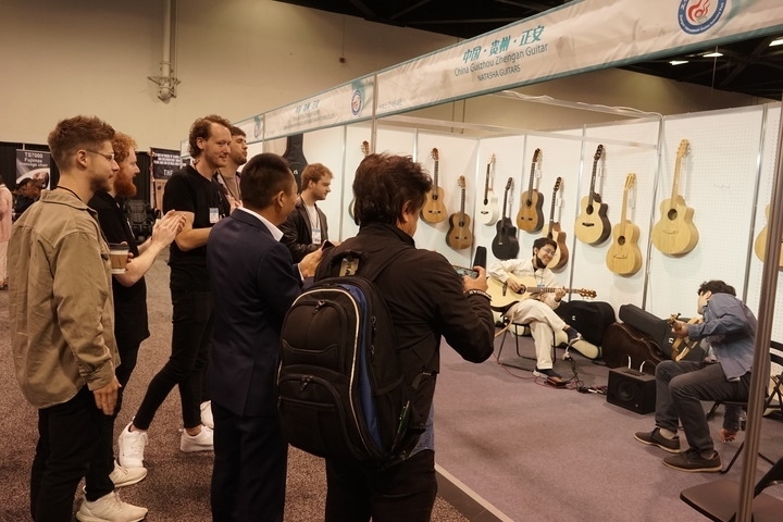 4月13日,在美國加利福尼亞州阿納海姆會展中心,參觀者在中國貴州正安吉他產業(yè)園一家公司展位觀看樂器表演。
