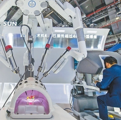 在醫(yī)療器械及醫(yī)藥保健展區(qū),參觀者正在體驗操作復星醫(yī)藥首臺國產(chǎn)“達芬奇Xi手術系統(tǒng)”。人民網(wǎng)記者 翁奇羽攝