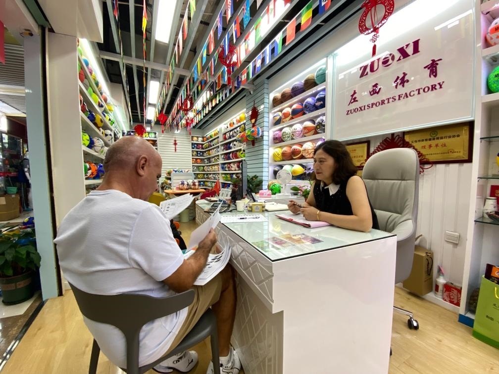 義烏國際商貿(mào)城內(nèi),經(jīng)營戶正在與國外客戶洽談。新華社記者魏一駿 攝